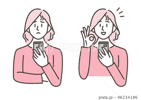 スマホを見て悩む&考える若い女性と、解決して笑顔の若い女性セット【ベクターイラスト素材】