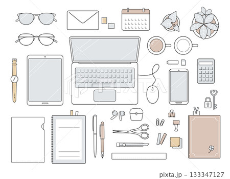 ミニマルなビジネス関連の俯瞰レイアウト|くすみカラーの上品なラインアイコンセット