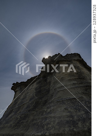 ニュージーランド ホークス・ベイのトゥティラにあるベル・ロックと太陽にかかるハロ現象
