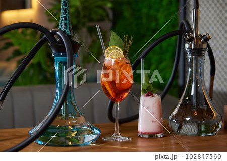 Wood hookah on table in hookah lounge.