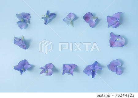 Flat lay with hydrangea or hortensia blue-purple petals, pastel blue background