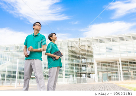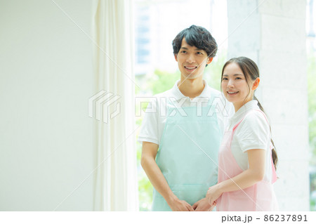 介護施設で働く若い男女の介護士 老人ホーム