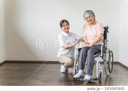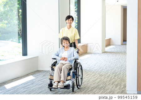 車椅子のシニア女性と若い介護士