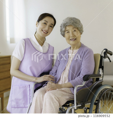 車椅子に乗るシニア女性と微笑む介護士女性
