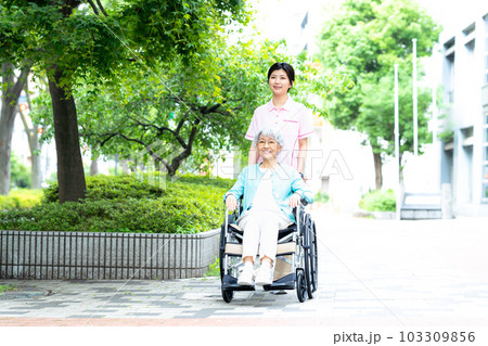 公園を散歩する車椅子に乗った高齢者と介護士(ヘルパー)