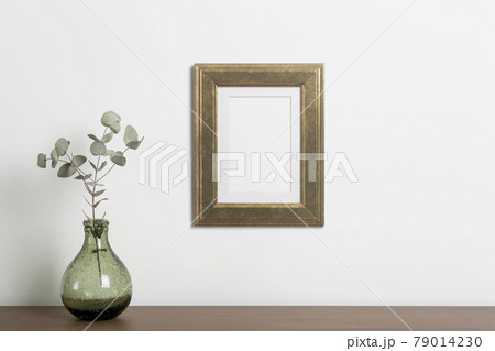 Mock up empty frame background. Empty decorative frame for a photo or painting in a light Scandinavian minimalist interior on a white clean wall.