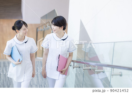医療 話しながら歩く女性看護師 撮影協力「LINK FOREST」