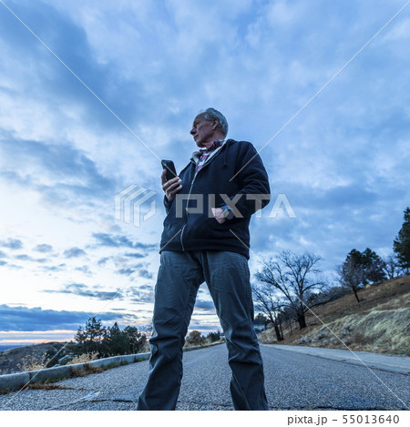 Low angle view of man holding smart phone on road
