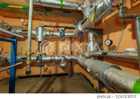 Technical heating pipes in the basement of a