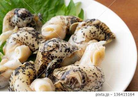 白背景にお皿に盛りつけたボイルつぶ貝(灯台つぶ)