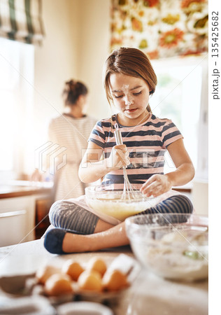 Girl, baking and dessert with bowl on table for cupcake mixture, batter or cooking at home. Little child, kid or baker mixing sweet ingredients or food for cookies, delicious treat or meal at house