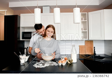Couple makes breakfast together in modern kitchen with eggs and flour on counter while smiling at each other and mixing batter in bowl