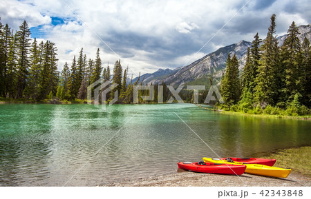 Canoes at Bow River in Banff National Park Canada