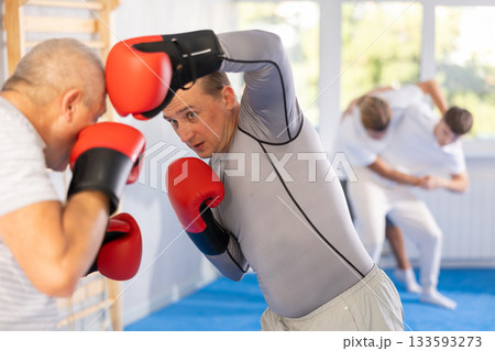 Man and guy at boxing training in gym practice striking techniques. Man put block on blow in his direction