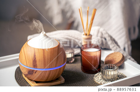 A cozy composition with an aroma diffuser and candles in a home interior.
