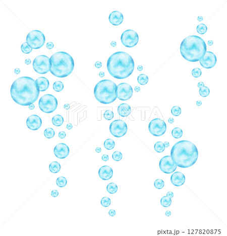 Set of vertical water bubble streams. Watercolor illustration. Blue transparent underwater element. Hand drawn isolated art. Soap bubbles for sea, underwater, cosmetic themes, childrens projects