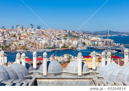 New Valide Sultan Mosque and the Galata Bridge, panorama from the Bosphorus. Istanbul, Turkey