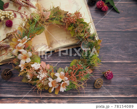 手作りのボタニカルなリースを作成中のハンドメイドのネットショップ作家の作品制作中のイメージ写真素材