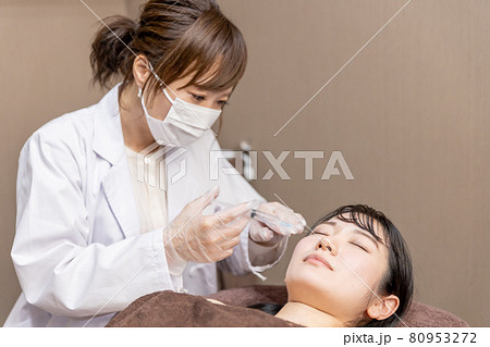 額・おでこにボトックス・ヒアルロン酸・脂肪注入注射を打つ患者と美容外科の医師