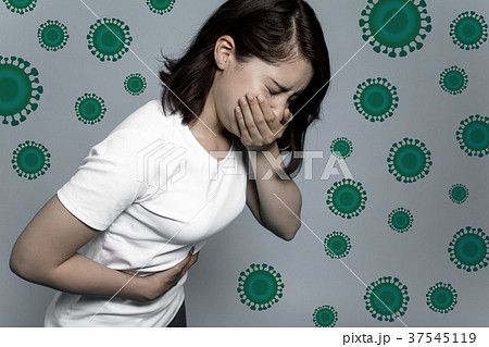 食中毒・吐き気のベクターイラスト 女性 ウイルス ウィルス 感染 下痢 嘔吐 風邪 貧血