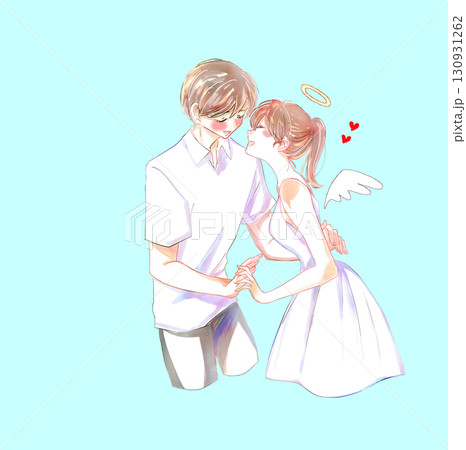 天使の女性と照れている男性