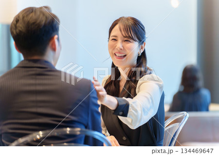ビジネスマンを褒めるビジネスウーマン(称える・ボディタッチ・応援・頑張れ・肩・冗談)