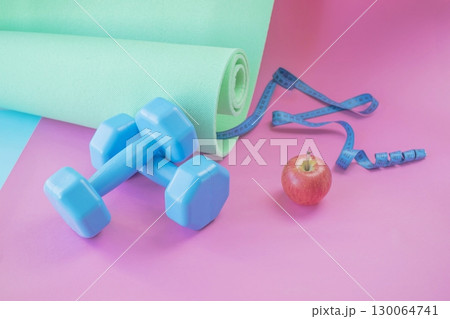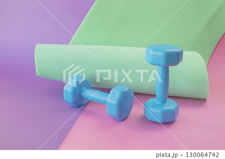 Fitness concept with dumbbells, measuring tape on bright background. Blue dumbbells and yoga mat on gradient surface.