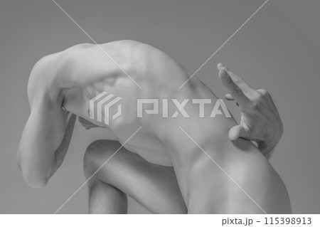 Human form in dynamic pose emphasizing motion and strength. Monochrome photography highlighting muscles and curves of defined male body.