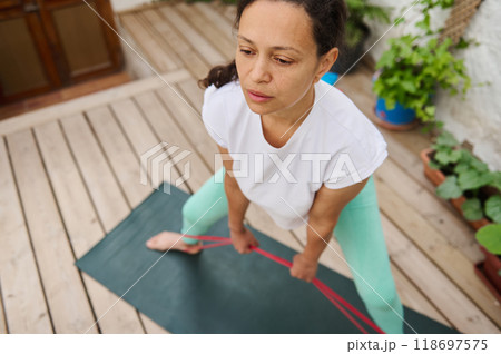 Woman practicing resistance band workout on wooden deck for home fitness and exercise routine