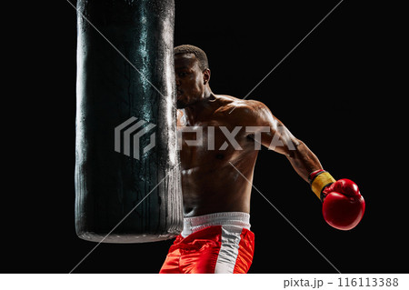 Focused and intense training session of muscular man, boxer hitting a heavy bag isolated on black background