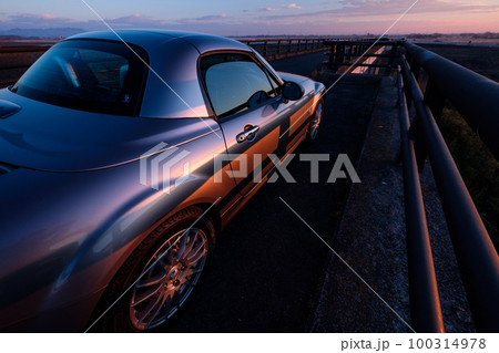 車のボディラインと朝焼け