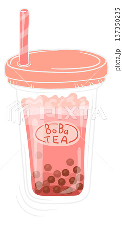 Bubble tea cup, pink drink, yellow straw, blue lid, black tapioca, red heart, cute style