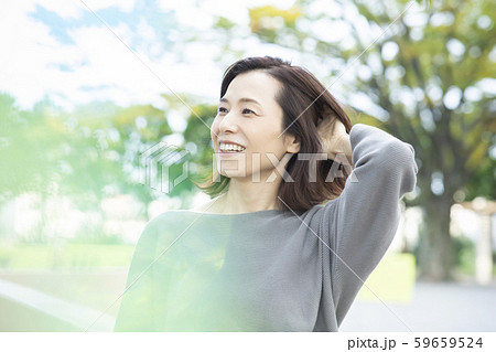 笑顔で髪を触る綺麗な大人の女性