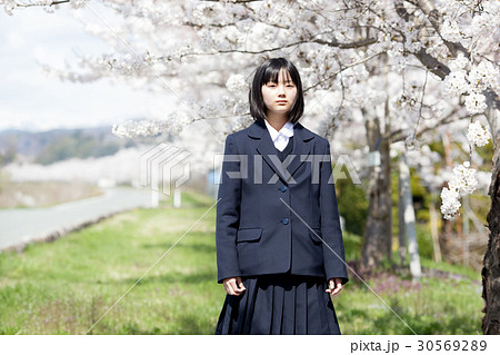 制服を着て桜の木の前に立つ女子高生