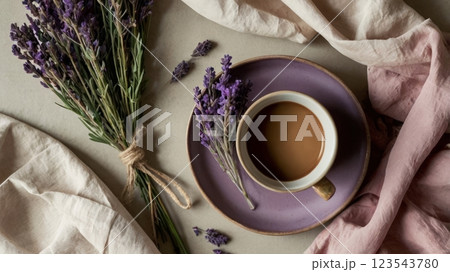 Rustic coffee cup with dried lavender on soft fabric.
