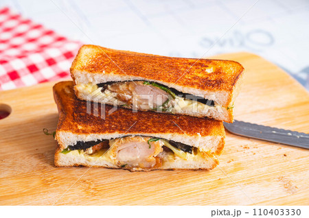 カットしたメンチカツのホットサンド