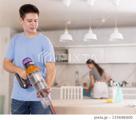 Young boy vacuum-cleaning in the kitchen while his girlfriend is dusting the kitchen