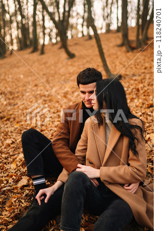 Young couple in love walking in the park on a autumn day. Enjoying time together.