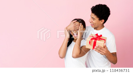Loving guy closing lady's eyes preparing gift over pink studio background, crop