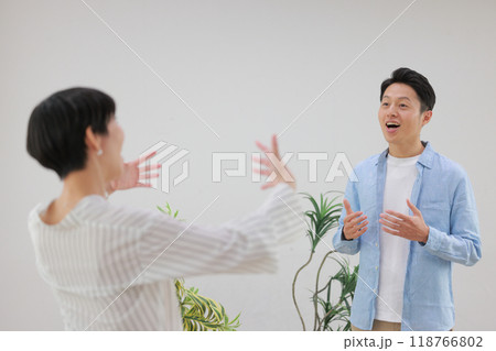 ボーカルトレーニングする男性と大きな身振りで指示するトレーナー女性_1