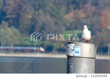湖の柱の上で休むカモメ