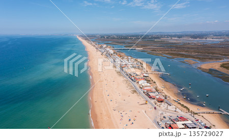 Aerial view captures Praia de Faro by Ria Formosa in Portugal. People enjoy the beach and water with boats in the water and buildings along the shore