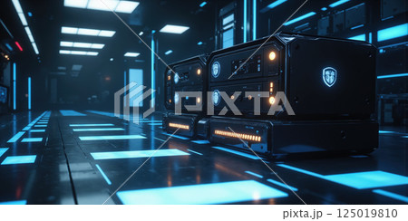 Cloud Backup System, stacked 3D data vaults with glowing security layers, blue energy pulses, isometric view