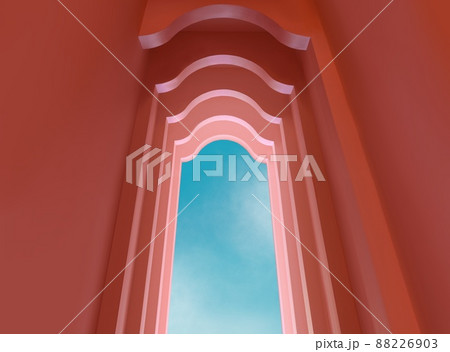 Perspective illustration of an arched gallery or corridor in an architectural structure and blue sky through it.