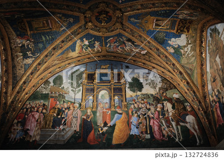 Vatican Museums grand gallery with narrative wall frescoes arches and decorative vaults Rome Italy. High quality photo