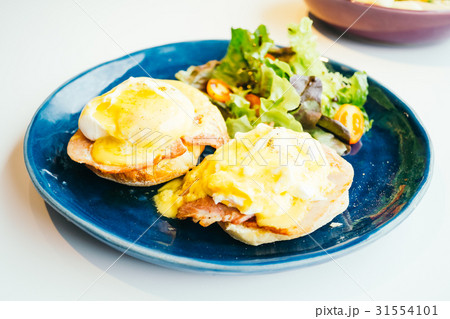 Breakfast Eggs Benedict toasted English muffins. Delicious breakfast with eggs Benedict