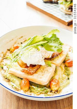 restaurant dish Brioche with poached egg with salmon and avocado. Delicious bread with greens