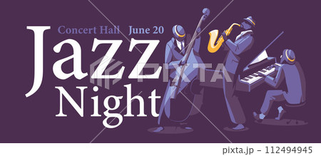 Advertising banner of a concert of jazz music. Musicians on large fonts and a dark background. Performance in a night club. Vector flat illustration