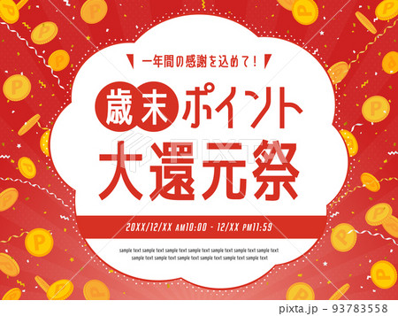 コインと紙吹雪、テープの舞う赤色背景/もくもくしたフレーム/サンプル文字入り(横向き)