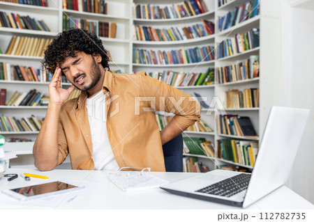 Sick hispanic male feeling intense spasms in head and backache while closing eyes in grimace of pain. Overworked freelancer working in uncomfortable position and getting interrupted by bad feeling.